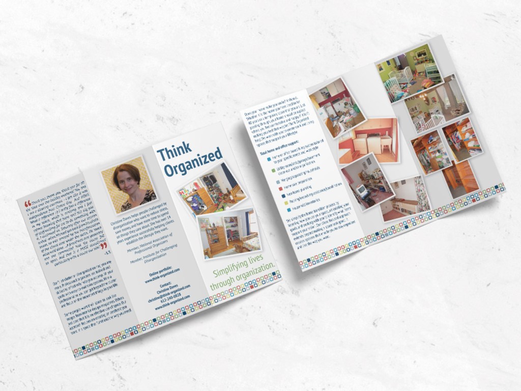 As a small business, referrals and word of mouth are incredibly important for Think Organized’s continued success, so the marketing materials I’ve created provide opportunities for the business to stay in touch with their customers and quickly inform new potential customers of their services.
